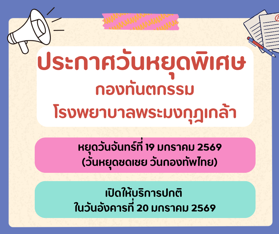 ประกาศวันหยุดพิเศษ เนื่องในวันหยุดชดเชยวันกองทัพไทย หยุดวันจันทร์ที่ 19 ม.ค. 69 เปิดให้บริการตามปกติ วันอังคารที่ 20 ม.ค. 69